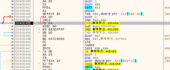 运行程序会进入pushad 就是把所有寄存器压入栈