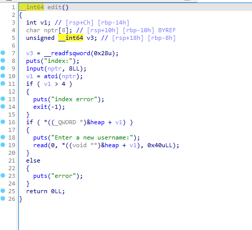 Edit时利用负索引劫持IO泄露libc,在heap找到一个指针,继续利用负索引将他指向heap然后劫持free_hook,接下来就是简单的设置参数get shell了